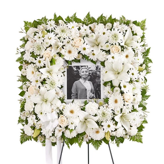 Offer solace with a sentimental arrangement for the services. Our square wreath features soothing white blooms and greenery for a lush, full presentation. A photo can be displayed in the center, creating a unique and beautiful tribute to a cherished loved one.